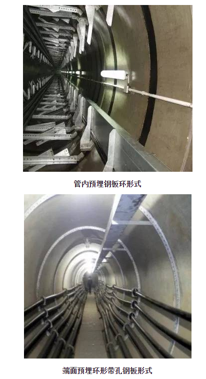 環(huán)形隧道的更大直徑達(dá)到3.5—4.0m?;静捎萌嵝越涌谄笮弯摻罨炷僚潘芎腿嵝越涌阡摮锌阡摻罨炷另敼?,管子設(shè)計(jì)參照GB/T11836《混凝土和鋼筋混凝土排水管》標(biāo)準(zhǔn)實(shí)施。但混凝土強(qiáng)度等級、抗?jié)B級別和結(jié)構(gòu)性能等技術(shù)指標(biāo)均大于普通鋼筋混凝土排水管的標(biāo)準(zhǔn)要求。  隧道內(nèi)電纜的不同安裝方法,要求預(yù)埋在管節(jié)內(nèi)的埋件、配件形式形狀不一樣,用得較多、較典型的有管內(nèi)預(yù)埋鋼板環(huán)形式、端面預(yù)埋環(huán)形帶孔鋼板形式和管內(nèi)預(yù)埋定位套管形式 (如下圖)。采用鋼筋混凝土管涵作為高壓電力電纜隧道所用管材的優(yōu)勢:管材全部工廠化加工,產(chǎn)品質(zhì)量容易得到保證;管道間接頭采用楔形橡膠圈柔性連接,膠圈壓縮率45%—50%。密封性能好;施工方法可以多樣化,可以采用開挖方式施工和頂進(jìn)方式施工,組裝速度快工程綜合成本低。箱形截面電纜隧道比園形截面電纜隧道更具有能有效利用空間的優(yōu)勢。