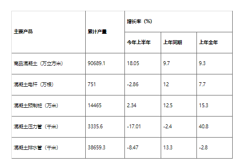表1  上半年混凝土與水泥制品行業(yè)規(guī)模以上主要產(chǎn)品生產(chǎn)情況