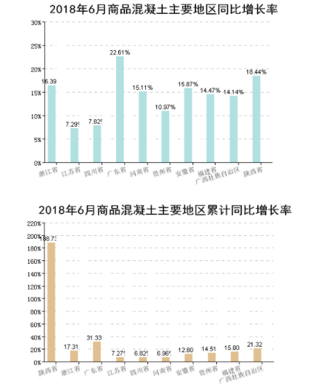 今年上半年,房地產(chǎn)開發(fā)投資增速較去年明顯增加,市場(chǎng)需求端放大,商品混凝土發(fā)展迅速,增速與去年同期,乃至上年全年都呈倍數(shù)增長(zhǎng),商品混凝土市場(chǎng)景氣(見圖4上半年全國主要地區(qū)商品混凝土生產(chǎn)增長(zhǎng)情況)。且由于原材料價(jià)格增長(zhǎng)(如砂石、骨料),商品混凝土的價(jià)格持續(xù)攀升,截止2018年6月30日混凝土價(jià)格指數(shù)為408.2,與去年同期相比增長(zhǎng)26.28%,同時(shí)擴(kuò)大了企業(yè)利潤(rùn)空間。